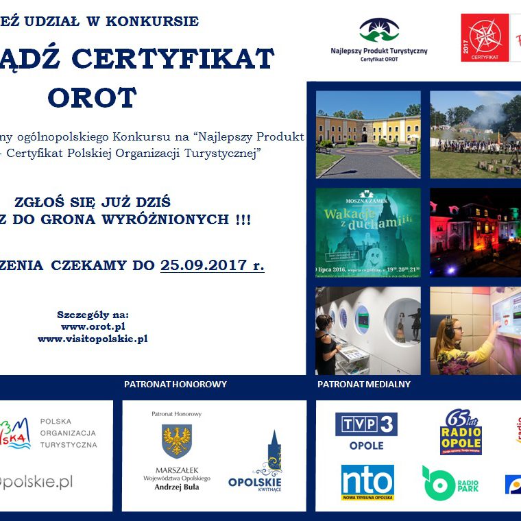 DetailsMiło nam poinformować, że ruszyła kolejna edycja konkursu na Najlepszy Produkt Turystyczny Województwa Opolskiego – Certyfikat OROT 2017. Jest to etap regionalny, XV edycji ogólnopolskiego konkursu realizowanego przez Polską Organizację Turystyczną na Najlepszy Produkt Turystyczny – Certyfikat POT.