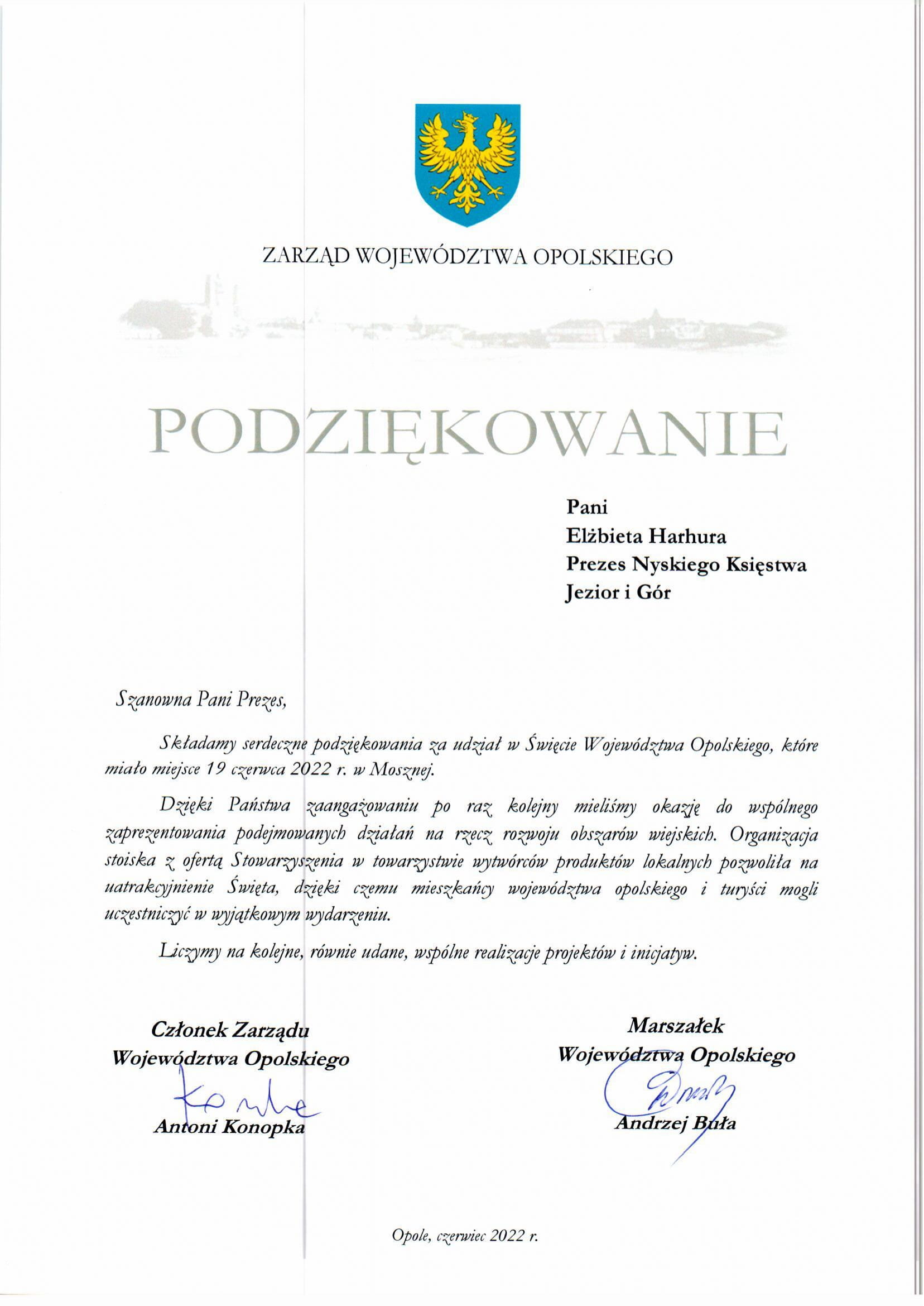DetailsPodziękowanie dla Pani Elżbiety Harhury – Prezesa Nyskiego Księstwa Jezior i Gór od Zarządu Województwa Opolskiego za udział w Święcie Województwa Opolskiego w dn. 19 czerwca 2022 r.
