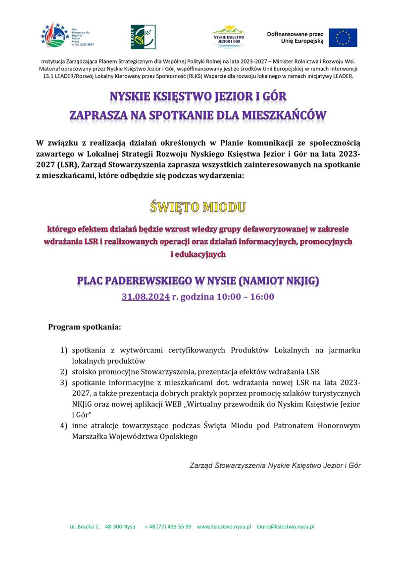 W związku z realizacją działań określonych w Planie komunikacji ze społecznością zawartego w Lokalnej Strategii Rozwoju Nyskiego Księstwa Jezior i Gór na lata 2023-2027 (LSR), Zarząd Stowarzyszenia zaprasza wszystkich zainteresowanych na spotkanie z mieszkańcami, które odbędzie się podczas Święta Miodu, którego efektem działań będzie wzrost wiedzy grupy defaworyzowanej w zakresie wdrażania LSR i realizowanych operacji oraz działań informacyjnych, promocyjnych i edukacyjnych.
