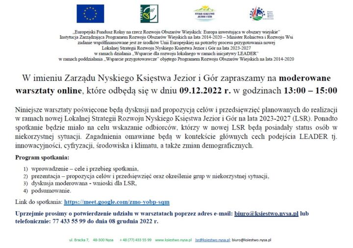 Zapraszamy na moderowane warsztaty online w ramach procesu przygotowania nowej Lokalnej Strategii Rozwoju na lata 2023 – 2027 przez Lokalną Grupę Działania Nyskie Księstwo Jezior i Gór