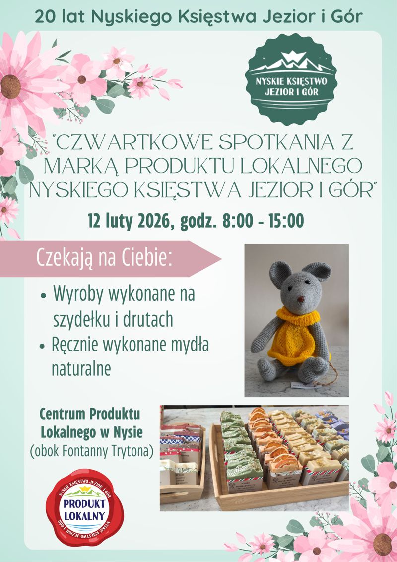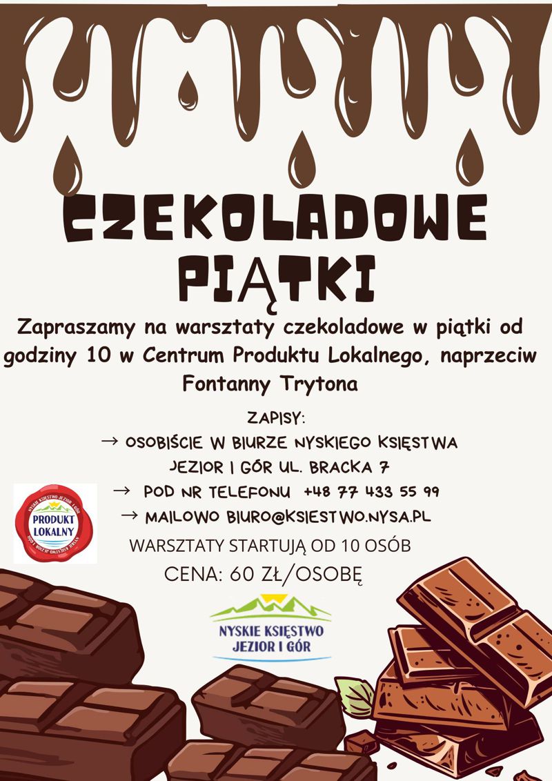 W ramach „Czwartkowych Spotkań z Marką Produktu Lokalnego Nyskiego Księstwa Jezior i Gór” w dniu 12.02.2026 r. zapraszamy do Centrum Produktu Lokalnego w Nysie (obok Fontanny Trytona) na kolejne twórcze warsztaty rękodzielnicze oraz spotkanie z marką Produktu Lokalnego. Ponadto w dniu 13.02.2026 r. (piątek) planujemy przeprowadzić warsztaty czekoladowe, podczas których uczestnicy poznają tajniki produkcji czekolady i samodzielnie stworzą własne słodkie wyroby.