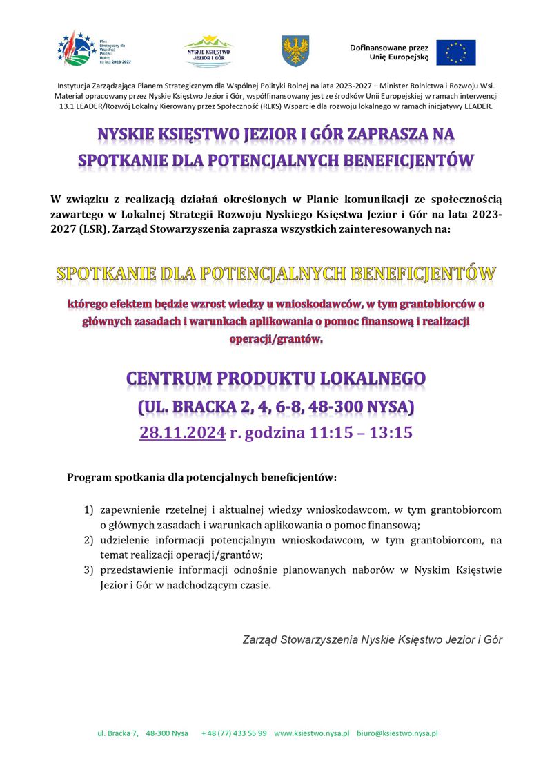 W związku z realizacją działań określonych w Planie komunikacji z lokalną społecznością zawartego w Lokalnej Strategii Rozwoju Nyskiego Księstwa Jezior i Gór na lata 2023-2027 (LSR), Zarząd Stowarzyszenia zaprasza wszystkich zainteresowanych na spotkanie dla potencjalnych Beneficjentów, które odbędzie się w Centrum Produktu Lokalnego, znajdującym się przy ul. Brackiej 2,4, 6-8, którego efektem działań będzie wzrost wiedzy u wnioskodawców, w tym grantobiorców o głównych zasadach i warunkach aplikowania o pomoc finansową i realizacji operacji/grantów. Więcej szczegółów znajdziecie Państwo na dołączonej grafice.